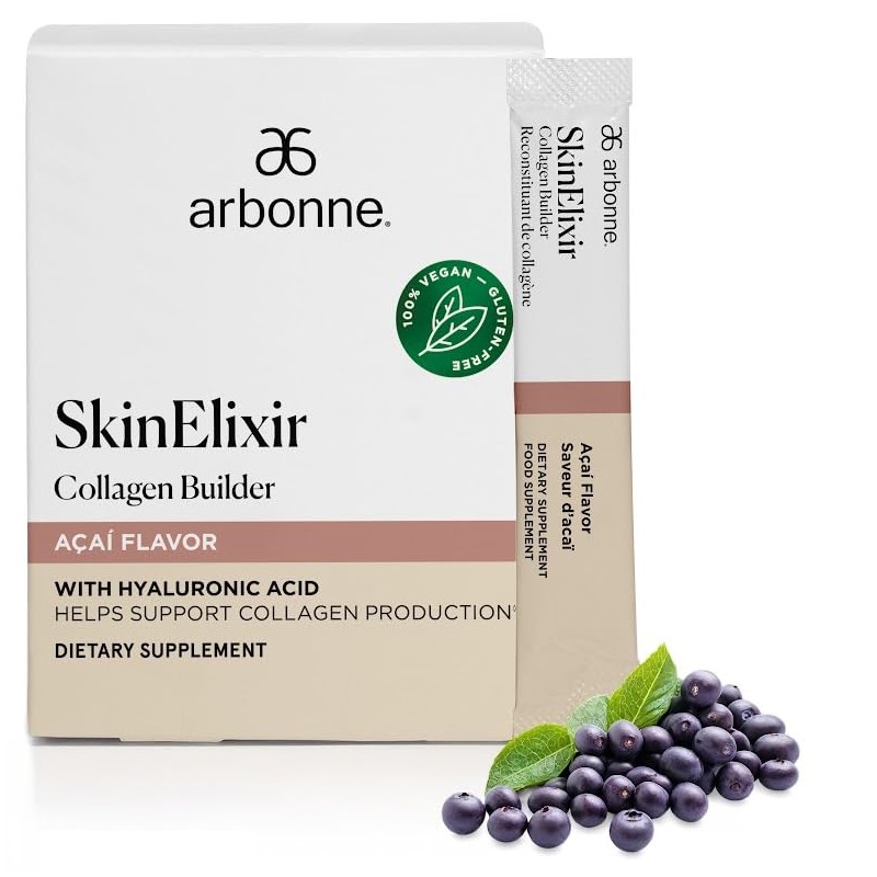 Arbonne SkinElixir Collagen Powder Builder - Açaí-Flavored Vegan Supplement for Women with Hyaluronic Acid, Vitamin C, Biotin & Antioxidants - Supports Healthy Skin, Hair & Nails - 30 Stick Packs