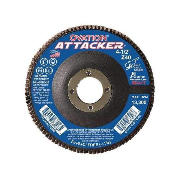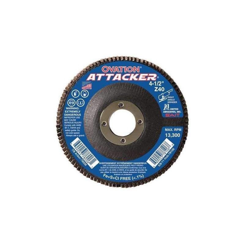- Price For: Each Backing Weight: X Series: Ovation Attacker Abrasive Type: Coated Backing Material: Cotton Abrasive Material: Zirconia Alumina Item: Arbor Mount Flap Disc Disc Type: Type 27 Mounting Size: 7/8" Disc Dia.: 5" Max. RPM: 12, 200 Grit: 80 Grade: Medium Country of Origin (subject to change): United States