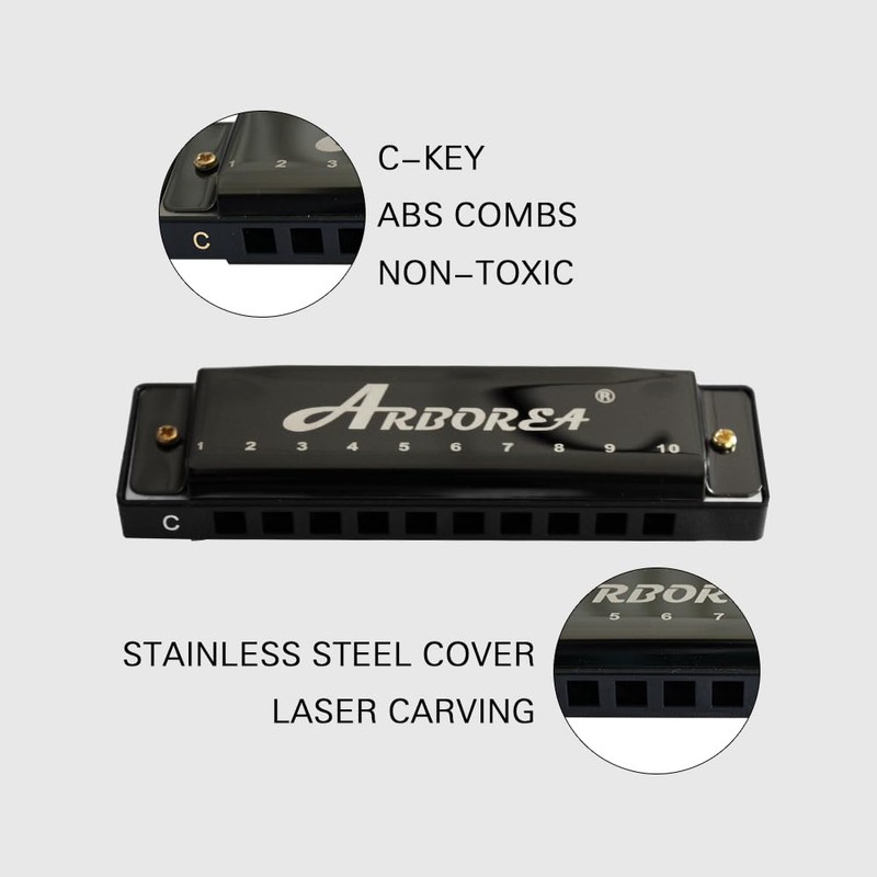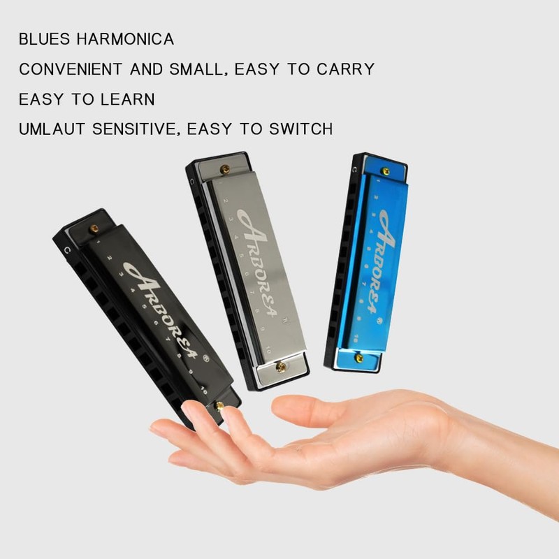 Arborea Blues C Key Harmonica with Case for Beginners and Adults 10 Hole 20 Tone Mouth Organ Stainless Steel Black