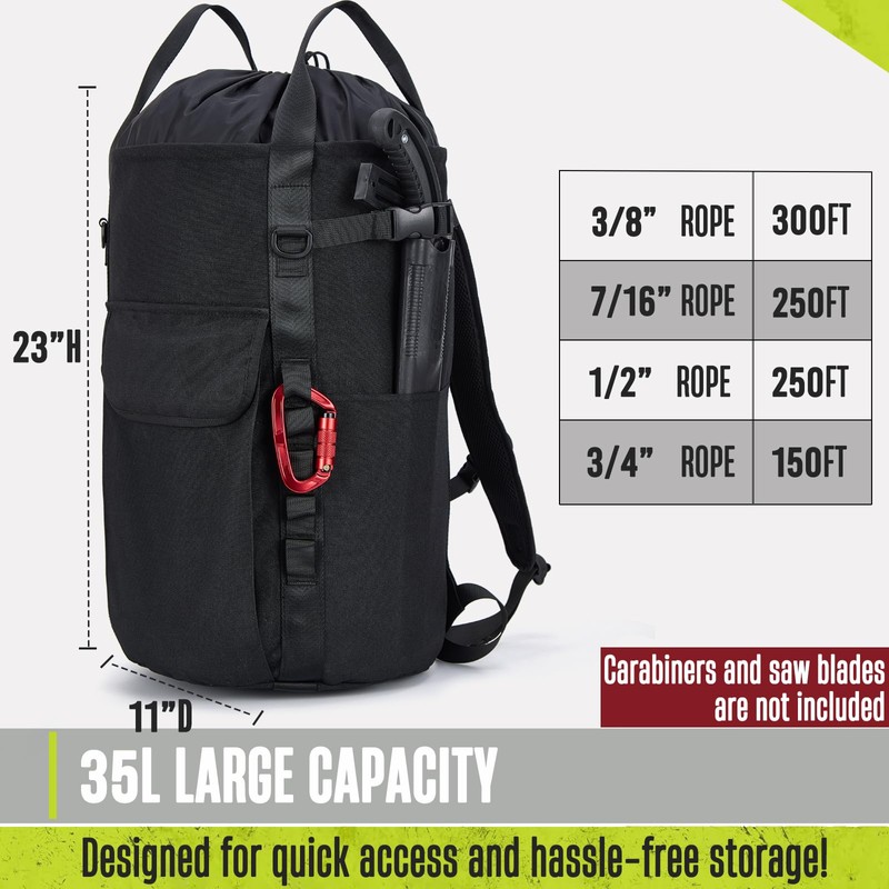 - Fast & Convenient Access: Measuring 23" (H) x 11" (D) with a 35L capacity, this tree climbing rope bag easily accommodates long ropes, including 250 feet of 1/2" rope, 150 feet of 3/4" rope, 250 feet of 7/16" rope, or 300 feet of 3/8" rope; The quickdraw closure secures your gear instantly with a simple pull of the drawstring, while the double-reinforced bottom provides extra protection during transport across job sites