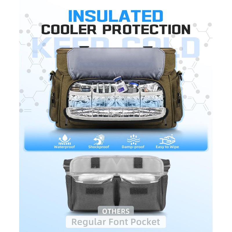 - INSULATED COOLER COMPARTMENT: The medicine organizer bag stores temperature-sensitive medications like insulin, eye drops, and allergy meds in the padded and waterproof EVA aluminum foil front cooler compartment to keep them at the correct temperature