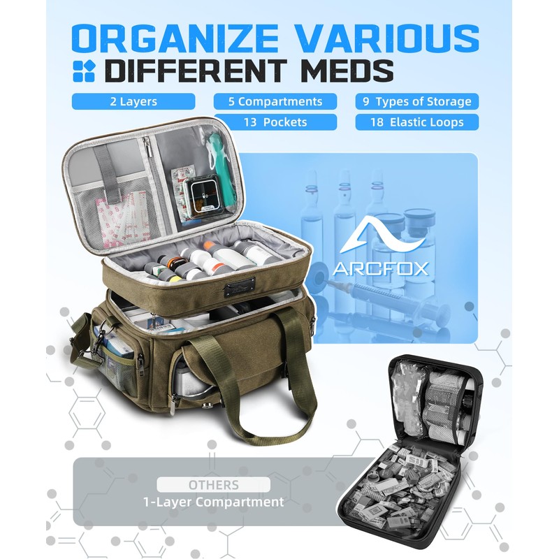 - ALL-IN-ONE ORGANIZATION: ARCFOX 2-layer medicine bag keep your medicine and medical supplies organized and in one place, featuring 5 compartments and 13 pockets for easy access and storage of different sizes, shapes, and types of rx and otc bottles, vitamins, and supplements