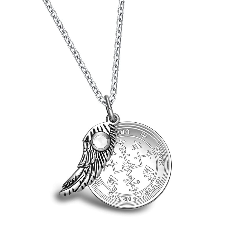 Archangel Uriel Sigil from The Ancient Book of King Solomon - St Uriel Necklace - Guidance Prayer Included - Angel Wing Pendant - Miraculous Medal - Guardian Crystal Amulet - Pastel White Crystal