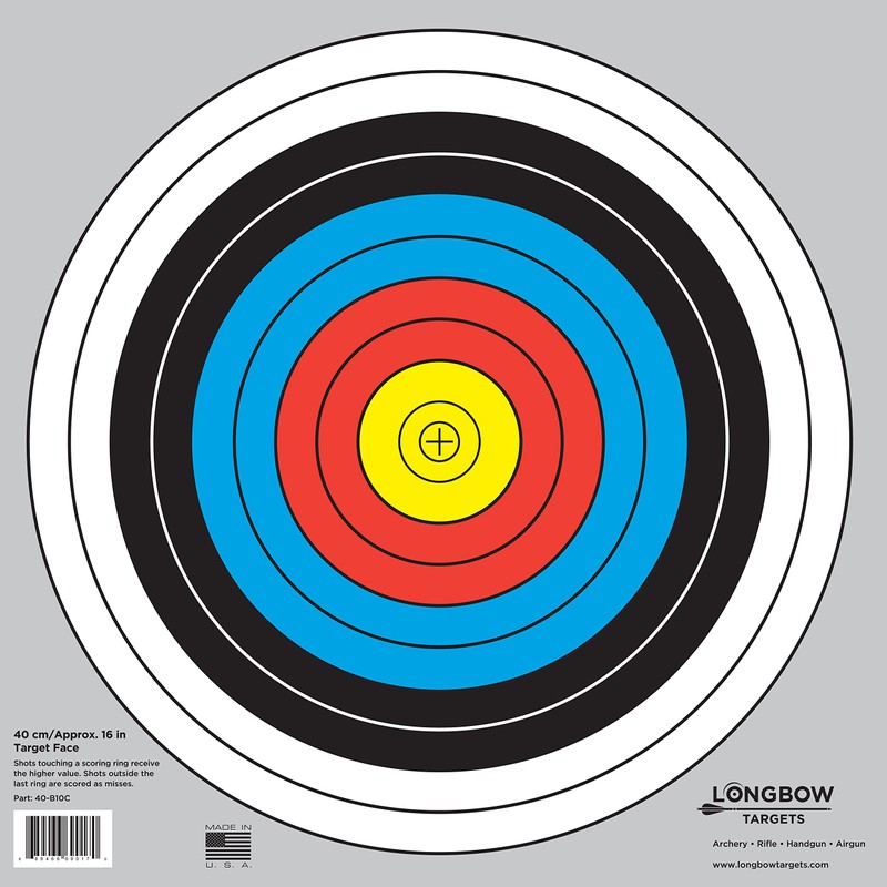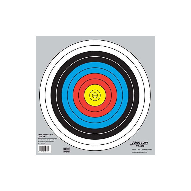 - Longbow 40 cm Targets are printed to exacting official standards. Each color ring edge is printed to an exacting 4cm from ring edge to ring edge.