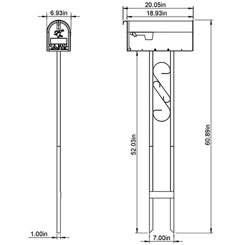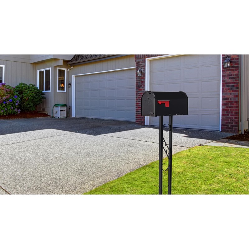 - Dual-reinforced steel mailbox post incorporates a decorative scroll design