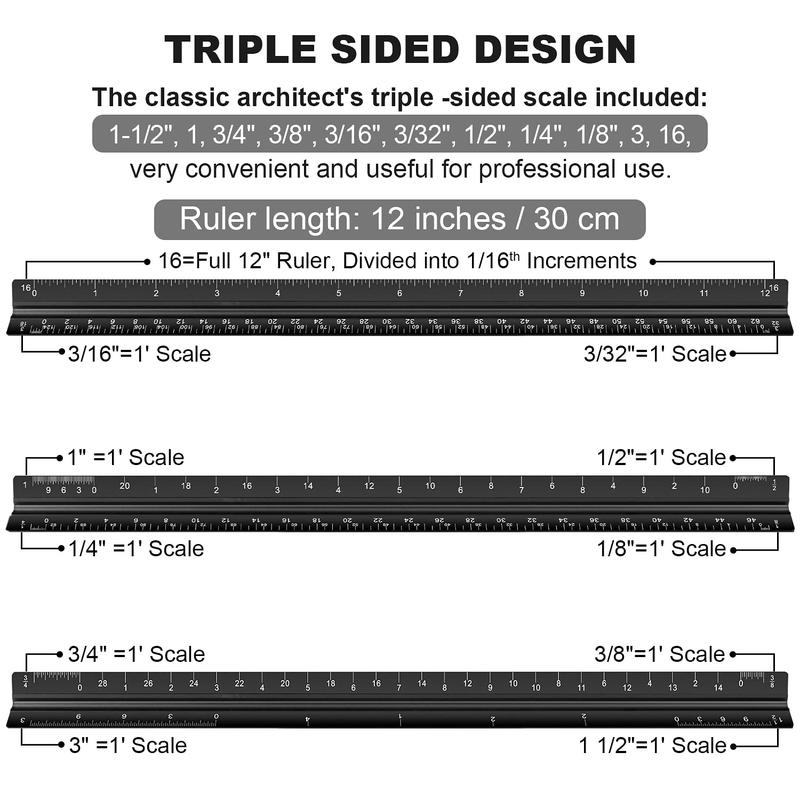 This architect's ruler has 3 Sides & 6 Different Scales. Triple-sided scale included: 1-1/2", 1, 3/4", 3/8", 3/16", 3/32", 1/2", 1/4", 1/8", 3, 16. The architectural scale