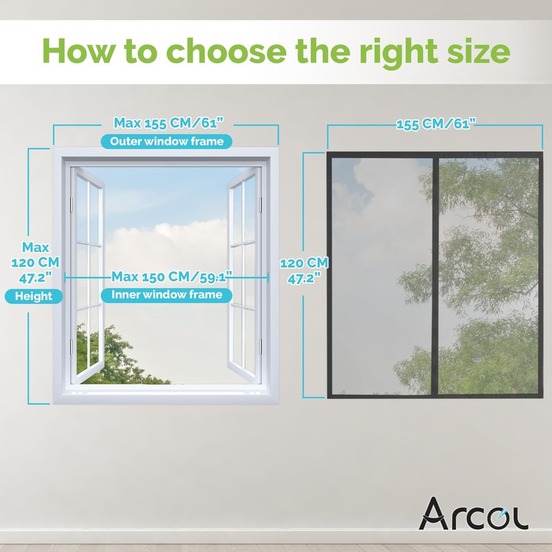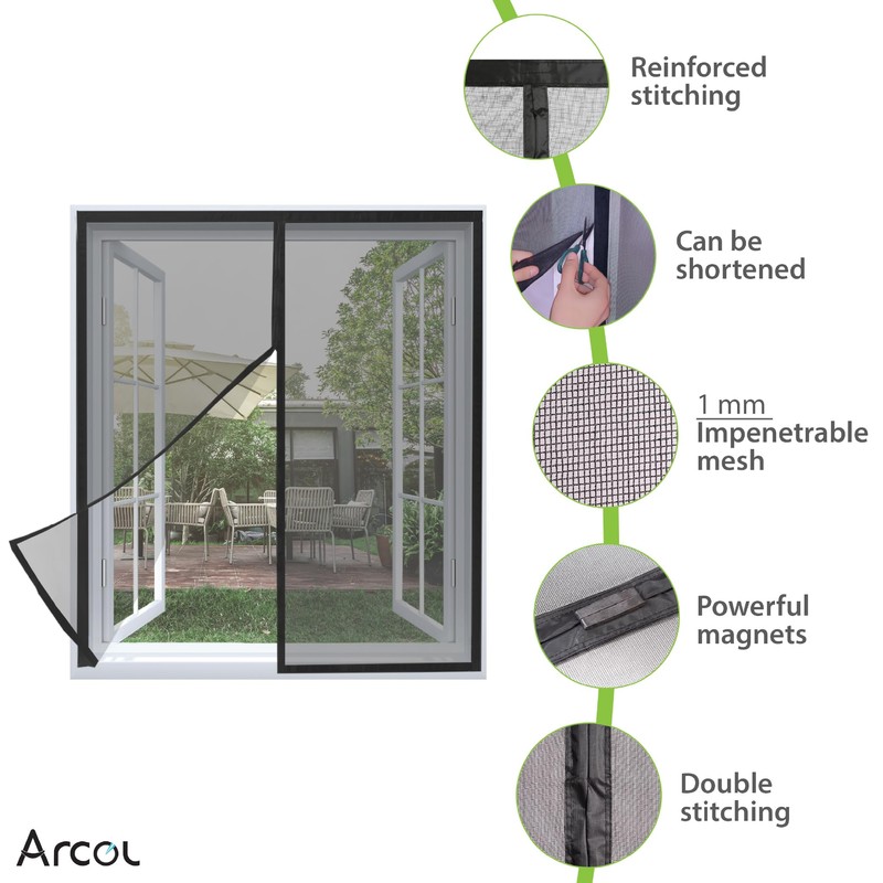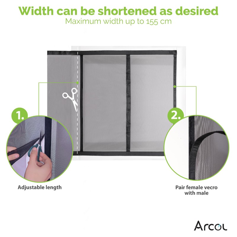 - FRESH AIR AND NOTHING ELSE - ARCOL window screens feature 1mm holes, thick polyester fabric and full length magnets that keep insects out and allow fresh air to circulate. It is the kind of fly screen with magnet that closes immediately behind you but is easy to open. Includes everything you need for installation and instructions (English language not guaranteed). how to cut it to size.