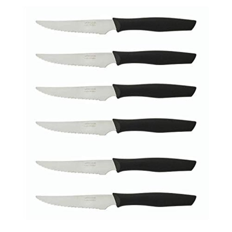 ARCOS Steak Set 6 pieces 4 Inch Nitrum Stainless Steel. Ergonomic Polyoxymethylene POM Handle and 110 mm Blade. Pocket Knife Pack with Pearl Edge for Cutting and Fillet Meat. Series Nova. Color Black