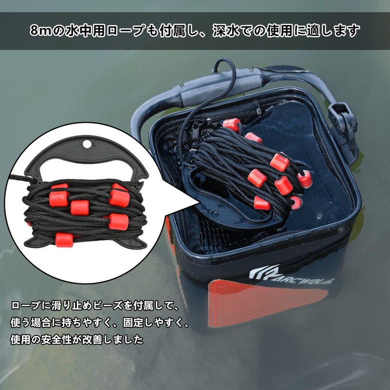 - Ergonomic: Designed with a TPR patch that feels good on the underside of the handle, so it fits in the palm of your hand for a comfortable grip. It also comes with an 8m underwater rope, suitable for deep water use. The rope comes with anti-slip beads, making it easy to hold when in use, and it is easy to fix and improves the safety of use. Furthermore, the bucket features a filter net lid and a two-way zipper to keep fish visible while preventing fish from escaping. In addition, when the zipper closes, you can fill it with water to effectively filter miscellaneous items to ensure clean water quality