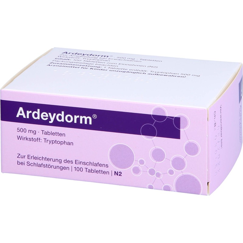 Ardeydorm Tabletten 500 mg Wirkstoff: Tryptophan. Anwendungsgebiete: fördert die Schlafbereitschaft und erleichtert das Einschlafen bei Schlafstörungen.