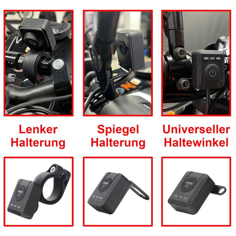 - Drei wählbare Wärmestufen für die perfekte Einstellung der Temperatur. Mit den verschiedenen Halterungen kann der Controller an mehreren Positionen am Lenker montiert werden.