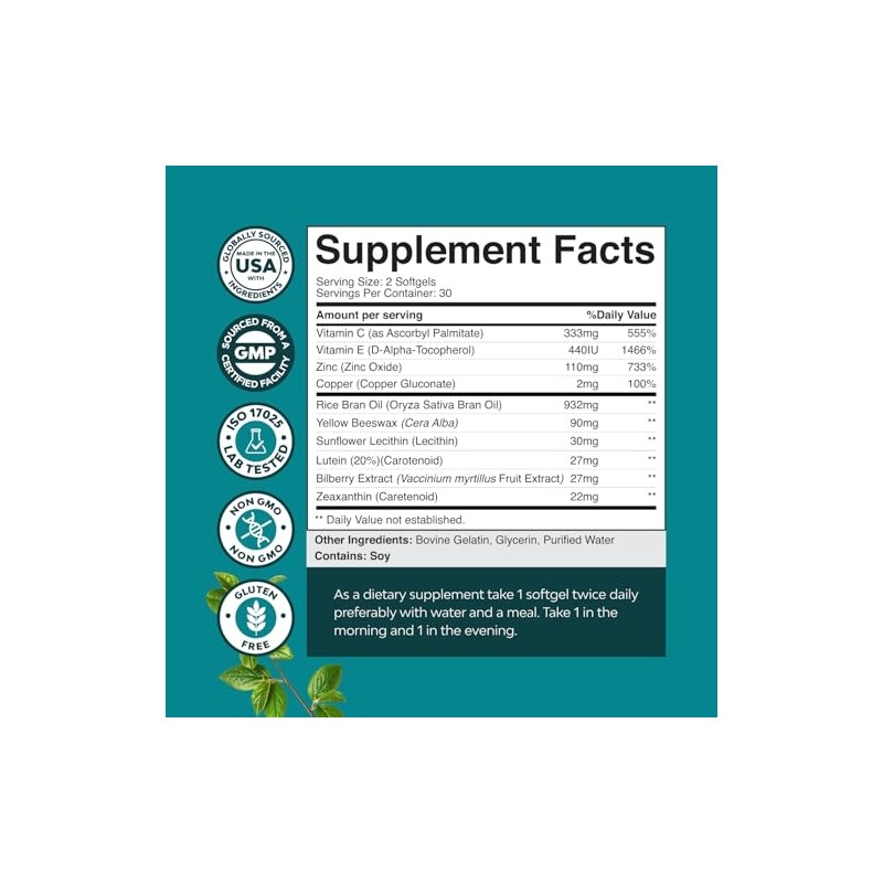 - What’s Inside - Our easy to swallow vision supplements for adults contain AREDS 2 standard Vitamin C Vitamin E Copper Zinc Lutein & Zeaxanthin and are made and tested in state of the art US labs