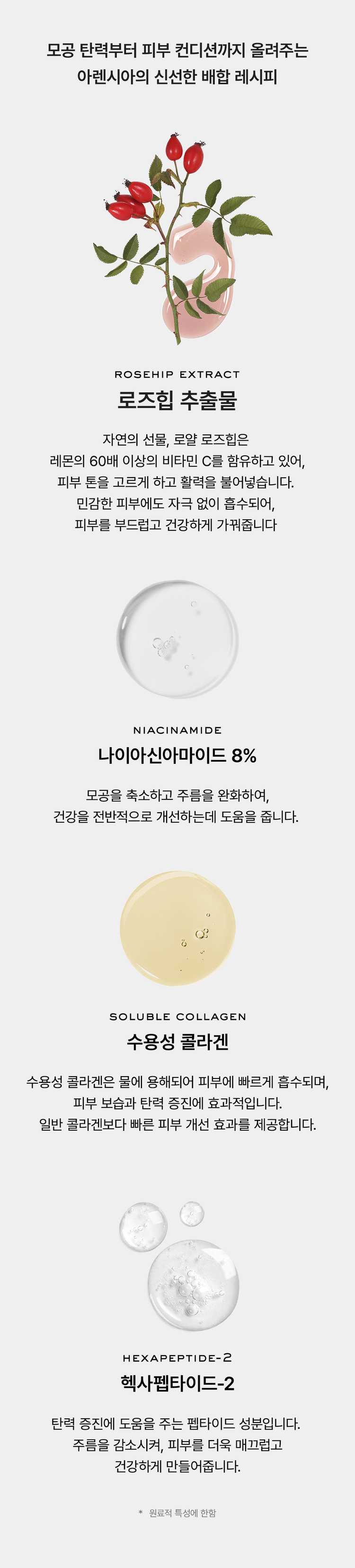 | 전성분 | 정제수, 글리세린, 나이아신아마이드, 부틸렌글라이콜, 다이프로필렌글라이콜, 아이소노닐아이소노나노에이트, 알부틴, 1,2-헥산다이올, 폴리글리세릴-10미리스테이트, 폴리글리세릴-10라우레이트, 알지닌, 카보머, 치자추출물, 덱스트린, 에틸헥실글리세린, 글리세릴아크릴레이트/아크릴릭애씨드코폴리머, 아데노신, 피브이엠/엠에이코폴리머, 다이소듐이디티에이, 알란토인, 잔탄검, 페룰릭애씨드, 효모/쌀발효여과물, 사탕무뿌리추출물, 월귤추출물, 인삼열매추출물, 프렌치로즈꽃추출물, 히비스커스꽃추출물, 로즈힙열매추출물, 헥사펩타이드-2, 수용성콜라겐, 하이드롤라이즈드디엔에이, 바이오틴, 3-O-에틸아스코빅애씨드, 소듐아스코빌포스페이트, 아스코빅 애씨드, 아스코빌글루코사이드, 토코페롤, 판테놀, 피리독신 |