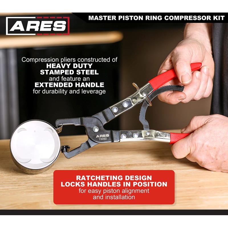 - APPLICATION: With its wide range of compressor band sizes, this kit is ideal for installing pistons on a variety of different vehicles. The plier jaws and compressor ring mate securely to offer increased control and security, and the ratcheting handles lock in position for simple piston alignment and installation with the use of a mallet or deadblow hammer. Pair this kit with the ARES 23052 Slim Line Deadblow Hammer for quick and simple piston installation.