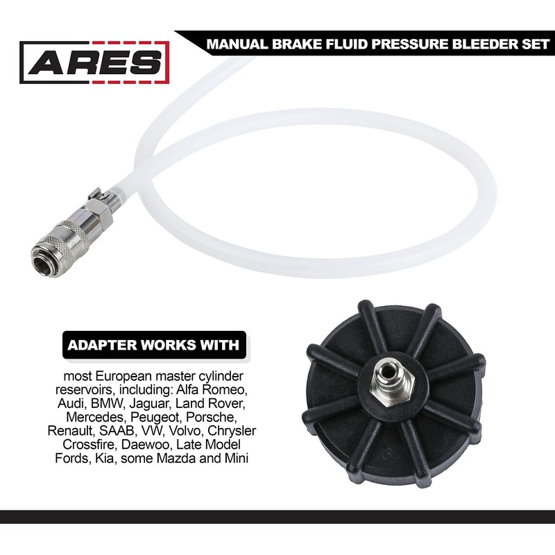 - APPLICATIONS: This brake fluid bleeder is designed to work with disc or drum brakes, and the included adapter works with a wide variety of vehicles, including: Alfa Romeo, Audi, BMW, Jaguar, Land Rover, Mercedes, Peugeot, Porsche, Renault, SAAB, VW, Volvo, Chrysler Crossfire, Daewoo, Late Model Fords, and Kia. Use this bleeder with ARES 18000-18007, 18054-18057, and 18035 Adapters only.