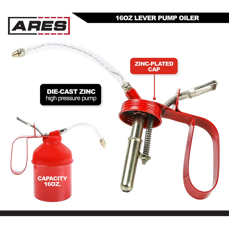 ARES 55010 – 16oz Red Lever Style Oiler Can - Includes Steel Braided Flex Hose & Offset Rigid Steel Nozzle – High Pressure Pump