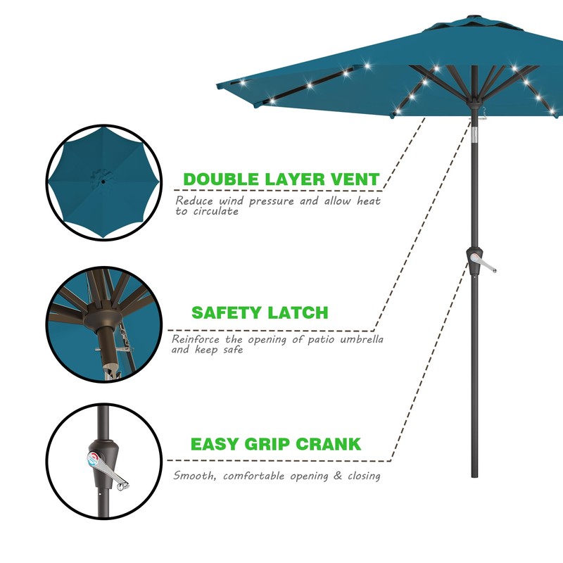 - 32 SOLAR-POWERED LIGHTS - 4 LED lights on each rib of patio umbrellas, 8 iron ribs construction, solar-powered 32 LED lights provide energy-efficient lighting, help to light up relaxing night and create warm atmosphere