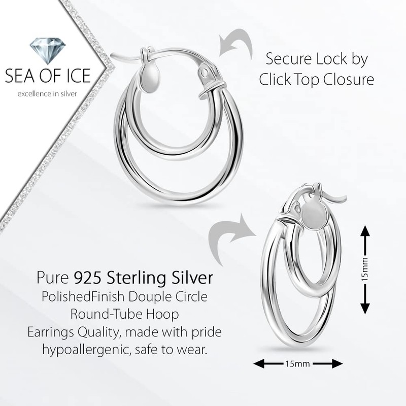 - Estos arete de aro redondos de doble círculo cuentan con un ancho de tubo de 1,5 mm, el aro más pequeño de 10 mm de diámetro y el aro más grande de 15 mm de diámetro, con cierre de clic.
