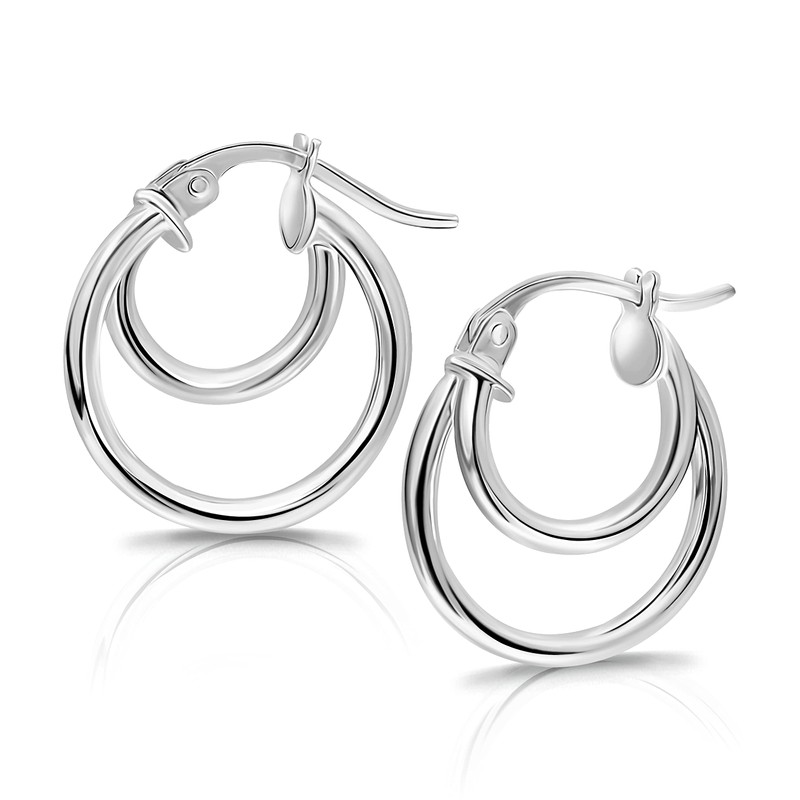 arete de aro de plata de ley con acabado pulido, doble círculo, redondos, 15 mm de diámetro. Plateado