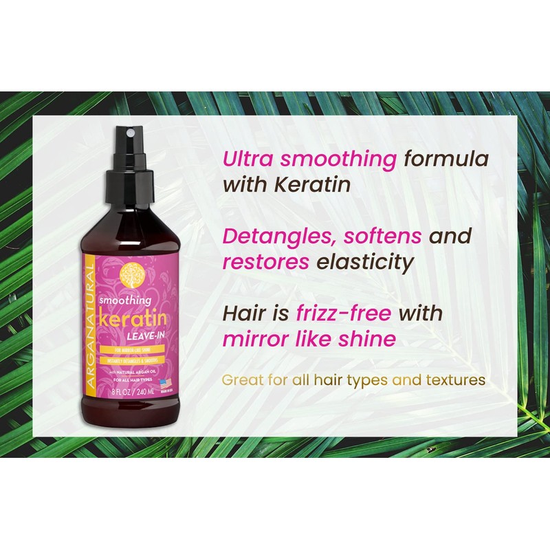 Arganatural Smoothing Keratin Leave-in Conditioner, 8 fl oz / 250 ml Spray Bottle, Smooth & Detangle Frizzy Hair