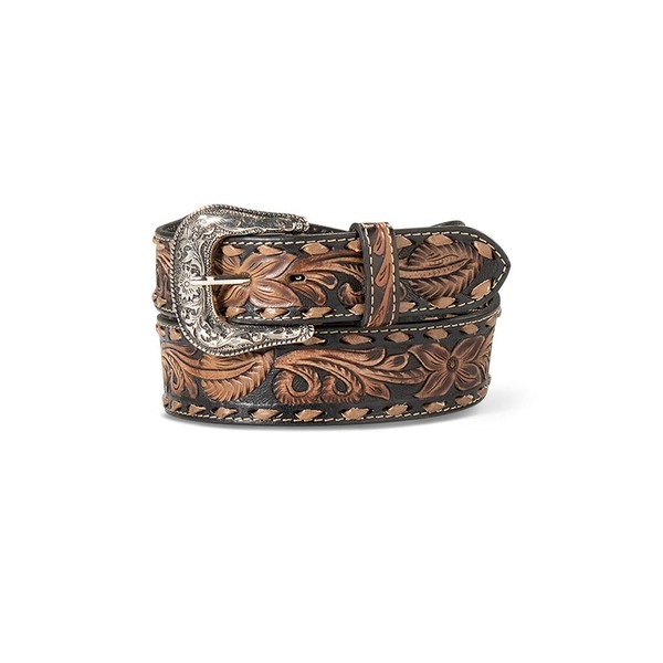 ARIAT Men's Hand-Tooled Floral Pattern Leather Belt w/Antique Silver Buckle, ...