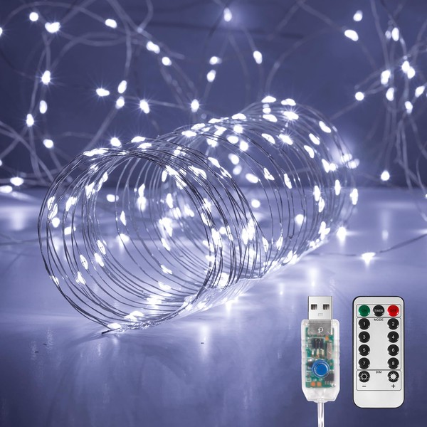 Ariceleo 1 Pack 32. 8 ft. USB Powered Fairy Lights with Remote & Timer, 100 LED USB Twinkle String Lights - Silver Wire, 8 Modes, Waterproof, Cool White Starry Lights for Party, Wedding, Christmas