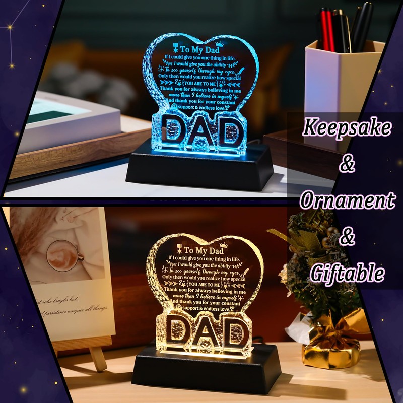 - Meaningful Gifts for Dad - With the word DAD carved on the bottom of the crystal and heart-warming words for dad engraved inside the crystal, this crystal plaque with light base is a perfect gift for dad. Give your dad this beautiful crystal gift on Fathers Day, Birthday, Christmas and tell him how much you care about him. He will be happy to receive this gift on his special day
