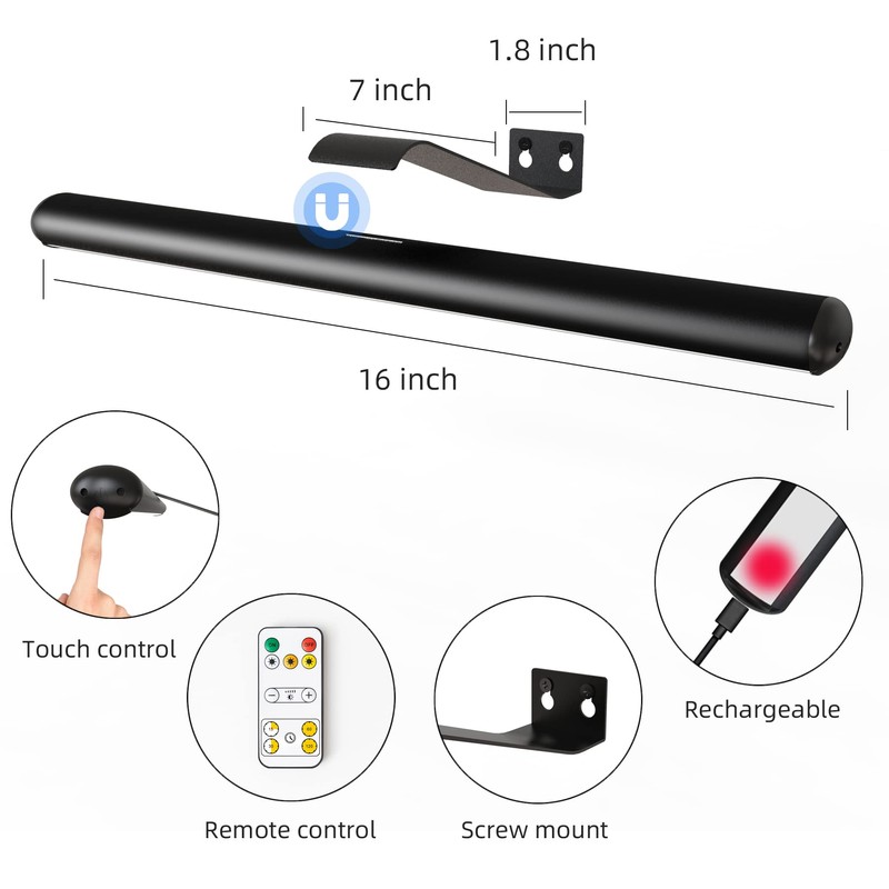 - 【Detachable Magnetic attach Rechargeable picture light】4000mAh rechargeable battery built-in, long lasting. Made of metal. The picture light bar is magnetic attached to the bracket ,easy take down to charge. The picture light's indicator light is red when on charging and turns green when fully charged.Coming with remote control to turn ON/OFF lights ,change colors, adjust brightness and set timer. One remote can control all picture lights.