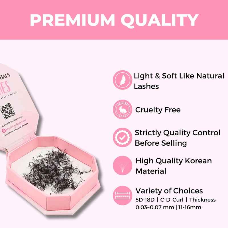 - 100% HANDMADE PROMADE FAN LASH EXTENSIONS FROM HIGH QUALITY MATERIAL: Ariya lashes extension promade fans are made from the highest material in Korea, featuring a tiny base and the softest, darkest fibers. This proven product is trusted by experienced eyelash technicians in Canada & United States. We strictly select raw materials, producing and testing by our high skilled craftmanship