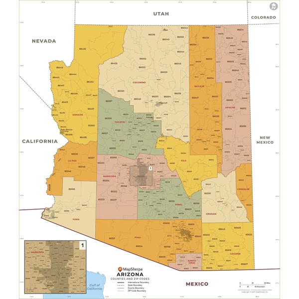 Arizona ZIP Code Map with Counties - Standard - 36" x 41.25" Laminated
