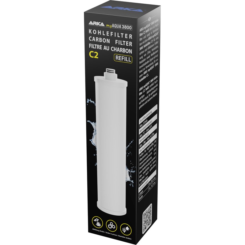 - ARKA myAQUA 3800 carbon filter C2 serves as a post-filter and in combination with the ARKA myAqua 3800 carbon filter C1 ensures a safe and effective removal of chlorine, herbicides and medication residues. Ideal for use with our ARKA myAqua 3800 reverse osmosis system.