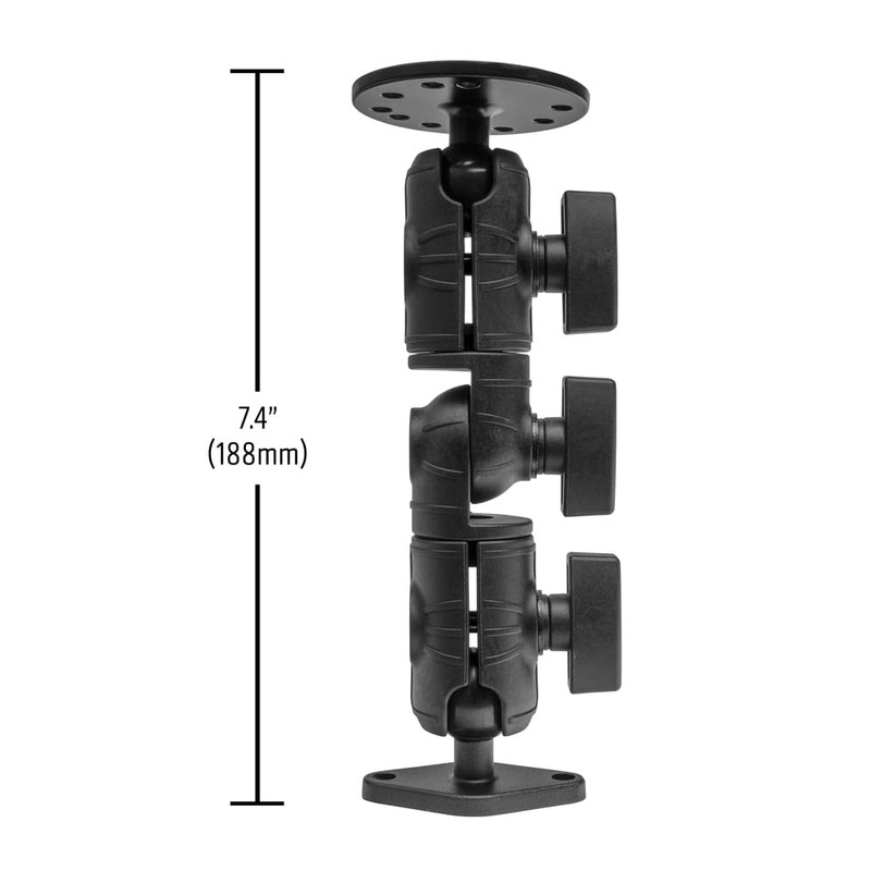 Arkon’s Ratcheting AMPS Mount is ideal for commercial and fleet vehicles. The 6-inch swivel shaft provides 5 points of articulation and positions the knobs for better access in tight places. The shaft features 180-degree ratcheting joint as well as a 360-degree center rotation and 25mm/1” rubber ball aluminum adapters. The diamond head is the best fit for tight locations or compatibility with 2 hole diamond-shaped patterns while the circular is best fit for larger locations or round-shaped patterns.