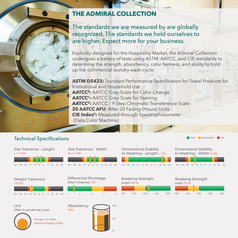 Our foundational institutional towel collection, the Admiral, is a value line of bath towels, bath mats, and pool towels made with an 86/14 cotton/polyester blend yarn. Premium 16 single ring-spun cotton pile with a strong polyester ground makes a soft, absorbent, and durable institutional with a long lifespan. If you need a tough economical, easy-care towel, Admiral is your towel.