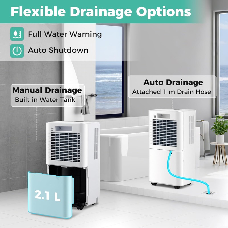 • Flexible Drainage Options: Equipped with a 0.55 Gallon built-in water tank that is simple to empty, this dehumidifier boasts effortless manual drainage. Additionally, its water tank indicator, full water warning and auto shutdown offer you peace of mind. Meanwhile, you can also choose convenient and gravity-based auto drainage with its 3.3 ft attached drain hose.