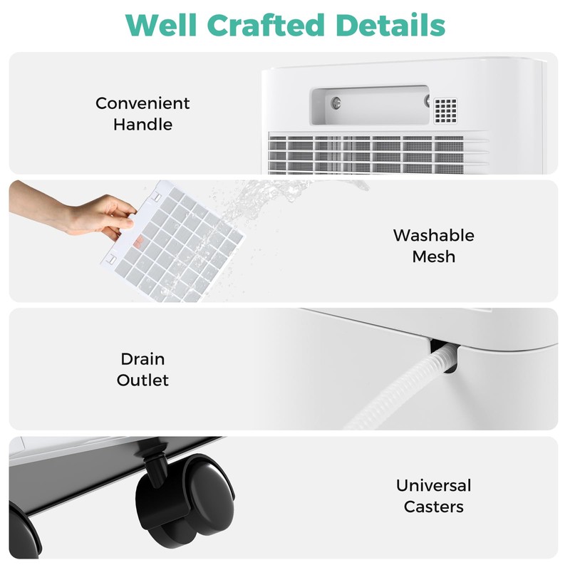 • Convenient Details & Functions: This dehumidifier is designed with a detachable and washable filter for easy upkeep. Additionally, you can move it easily with its universal casters. It also offers auto defrost function for cold weather conditions, memory restart for convenience and child lock to ensure safety.