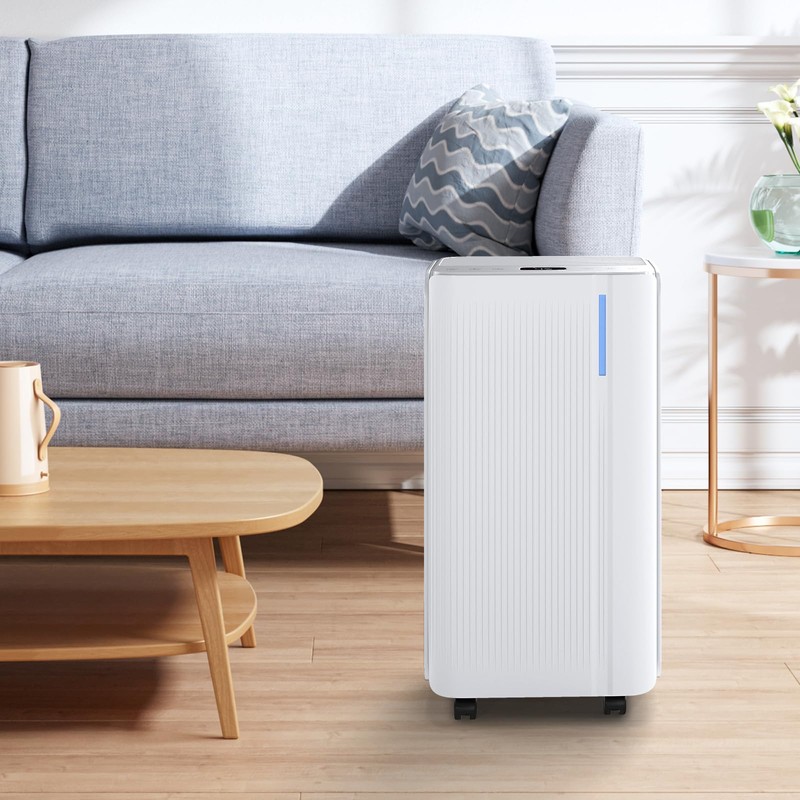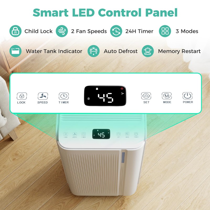 • Customizable Humidity Control: This dehumidifier features a smart LED control panel for easy operation, providing customizable comfort with 3 dehumidifying modes (auto, continuous drying, sleep) and 2 fan speeds (high, low). There is also a 3-color indicator light that shows ambient humidity levels: blue (humidity≤45%), green (45%