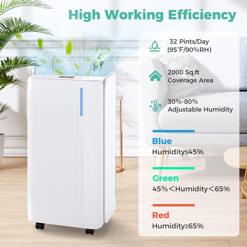 • High Working Efficiency: This dehumidifier is able to remove up to 32 pints of moisture per day at 95℉ and 90% RH, with an adjustable humidity range from 30% to 80%. It is ideal for large spaces up to 2000 Sq.ft like basements, garages and living rooms, efficiently tackling high humidity challenges.