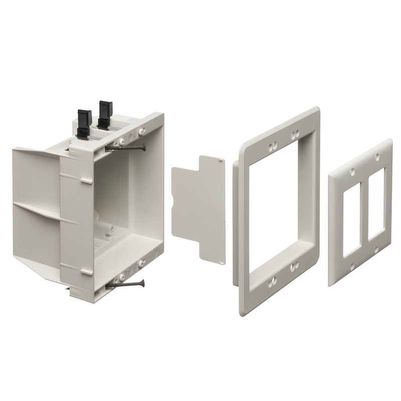 Arlington DVFR2W-1 Double Gang Recessed Electrical Box. Arlington's Recessed Indoor IN BOX, DVFR2W-1, is for New and Retrofit Construction. Non-metallic, recessed electrical box with trim plate. The two-gang style allows you to install two duplex receptacles, or two low voltage devices in the box. But with the supplied separator you can also install one low voltage device and one power one.