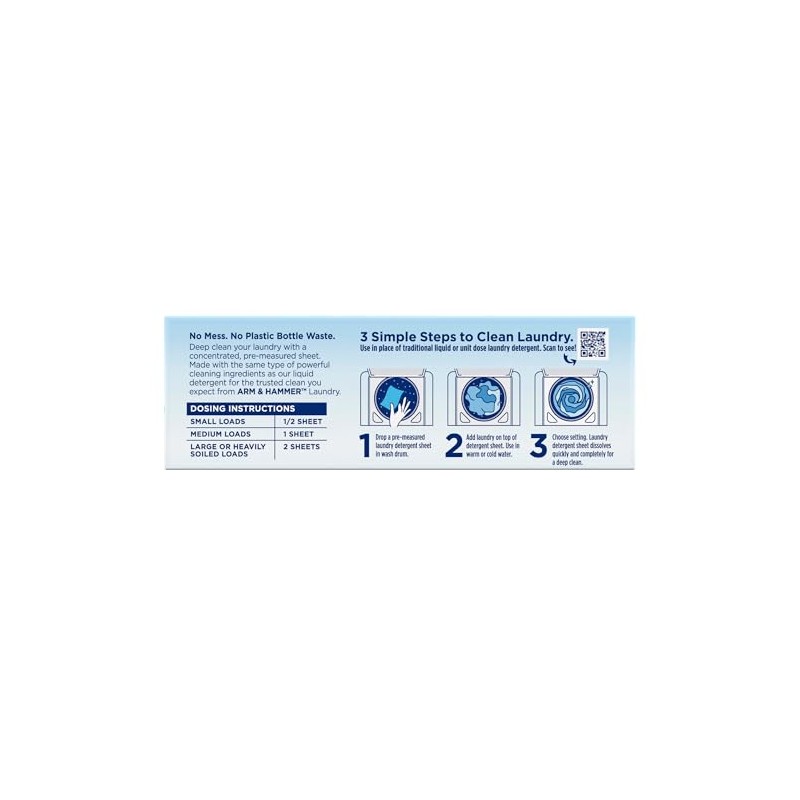 Toss like this, wash like this with ARM & HAMMER Power Sheets Laundry Detergent, Fragrance Free for a no-mess laundry bliss! These fragrance free laundry detergent sheets are dermatologist tested, dye-free, unscented, and perfume-free. They come in lightweight, recyclable boxes so no more lugging and pouring heavy, drippy bottles. Are you concerned about your impact on the environment? ARM & HAMMER has designed this product to eliminate plastic bottle waste. This innovative laundry detergent sheet is ideal for travel—it is light, portable, and convenient for a laundromat or your suitcase. The no-bleach, no-ammonia concentrated laundry detergent sheets are tough on odors, dirt, and stains. These unscented HE detergent sheets can handle tough loads of dark, colored or white clothing in all wash temperatures, even cold water. Thanks to Quick Dissolve Technology, these high efficiency laundry detergent sheets dissolve completely in water. Use 1 sheet for small loads, or 2 sheets for medium loads. Made with the same type of powerful cleaning ingredients as ARM & HAMMER Laundry liquid detergents, for the trusted clean and value you expect from ARM & HAMMER.