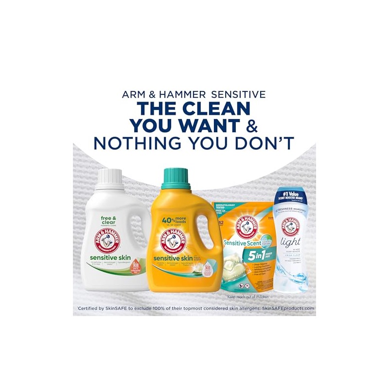 ARM & HAMMER Sensitive Skin Free & Clear Liquid Laundry Detergent is gentle on skin, but powerful on dirt. This free and clear detergent is concentrated with 2X powerful stain fighters in every load versus the leading value detergent, making it powerful enough to handle your toughest loads in all wash temperatures, even cold water. Free from dyes, perfumes and preservatives, this hypoallergenic laundry detergent is dermatologist-tested and certified 100% by SkinSAFE (1). This low-sudsing laundry soap rinses clean and works in standard machines and High Efficiency (HE) models as an effective and efficient hypoallergenic detergent. Blended with trusted ARM & HAMMER Baking Soda, this HE detergent is tough on odors, dirt and stains, leaving clothes clean and fresh.