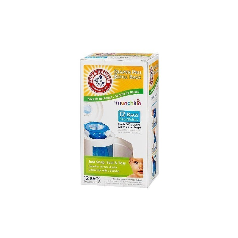 Munchkin Arm & Hammer Diaper Pail Disposal Bag Refills 12-Pack Designed to hold up to 25 diapers each, the Munchkin Arm & Hammer Diaper Pail Disposal Bag Refills 12-Pack use baking soda for strong, odor-fighting power. These disposal bags are compatible with the Munchkin Arm & Hammer Diaper Pail (sold separately) and shut tight with a snap to lock in odors. Product Highlights Snaps shut to help lock in odors Disposable design is compatible with the Munckin Arm & Hammer Diaper Pail (sold separately) Designed with baking soda to fight tough odors from dirty diapers Each bag holds up to 25 diapers