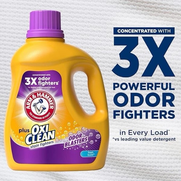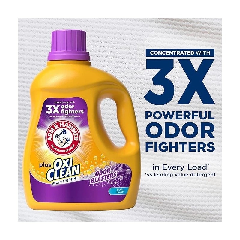 - ARM & HAMMER BAKING Soda Plus Odor Blasters He Laundry Detergent, 100.5 Fl Oz Liquid detergent, Triple-Power HE Laustering, Fresh Burst Scent, Triple Power Clean Deep, OxiClean Stain Eliminator, OxiBlaster Odor Blaster, trusted in millions of homes for decades.