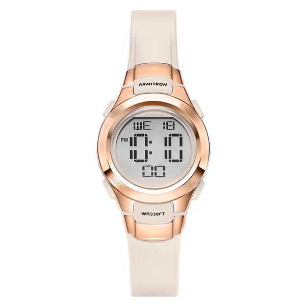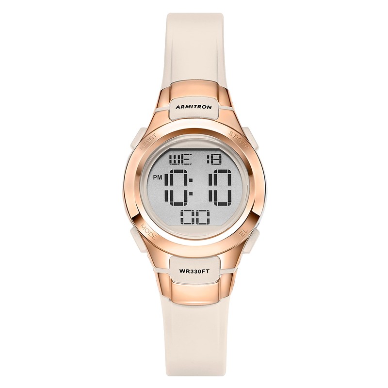 - Matte pale pink/beige resin case with rose gold tone top ring; LCD display with time, seconds, day and date; Matte pale pink/beige resin strap with buckle closure