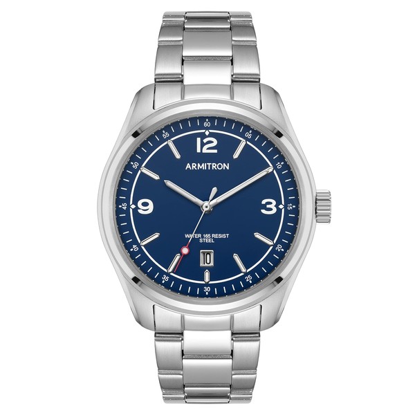 - Matte navy blue dial with date calendar window; silver-tone luminous hands and markers; white outer minute track