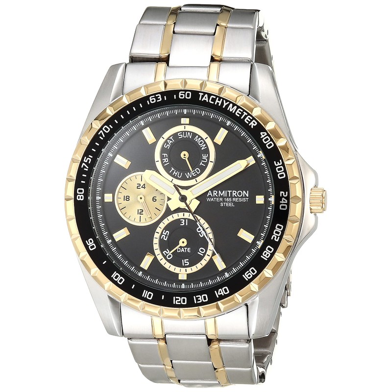 - Black sunray dial with day, date and 24 hour subdials; gold-tone luminous hands and markers; white printed outer minute track