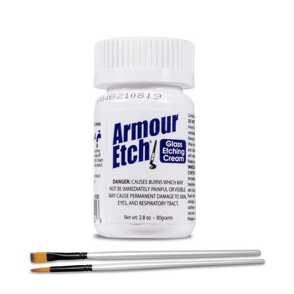 • Armour Etching Cream for Glass 2.8oz Net Weight - Armour Etch is a fast acting specially formulated glass etching compound that lets you create permanent etched designs on windows, mirrors, and household glasswares. Please note product is sold by weight not volume and bottles are intentionally not fully filled by the manufacturer.