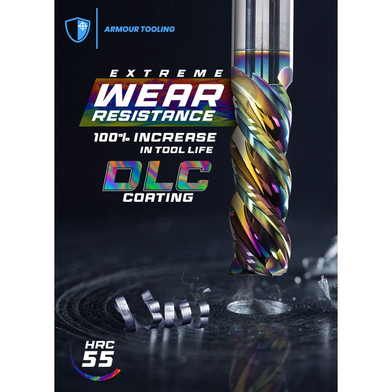 - đź”· DLC COATING - The Diamond like carbon coating ensures that the milling cutter tool life is maximised, providing great lubricity to prevent material build up on sticky materials like aluminium and also offers superior wear resistance at high cutting speeds and temperatures.