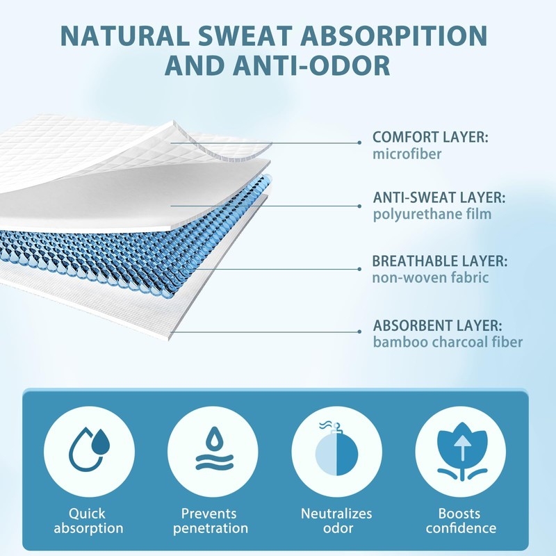 - 🔰【Natural sweat absorption and anti-odor】The arm pit sweat guards has a three-layer innovative structure of microfiber, natural fibers, and non-woven fabric, which can quickly absorb excess underarm sweat and prevent sweat stains from penetrating into clothing.Particles with 500m²/g adsorption surface area can neutralize odor, ensuring freshness and confidence are always with you