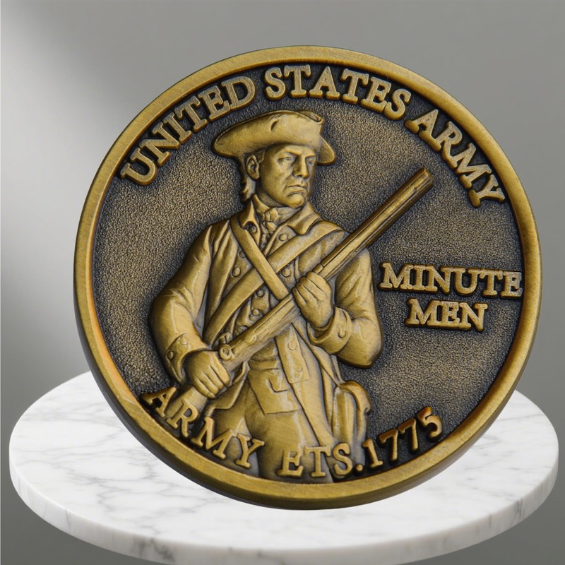 Crafted from sturdy alloy and featuring gold plating on both sides, this double-sided 1.57" coin displays high-relief engraving for unmatched depth and detail. On one side stands a Revolutionary War militiaman, representing the Army’s founding era. On the reverse is the official U.S. Army emblem, polished to brilliance and highlighted in raised relief.