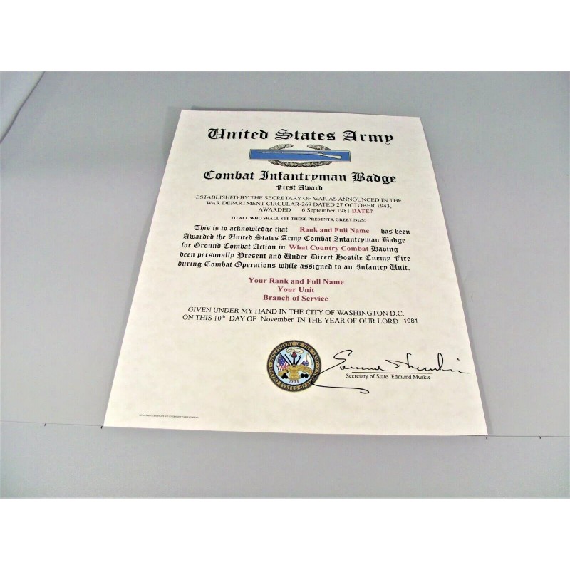 Army Combat Infantryman Badge Medal Replacement Certificate-Not embossed CIB